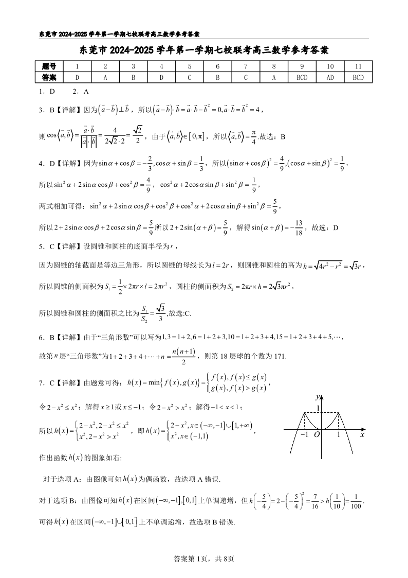 东莞市2024—2025学年第一学期七校联考 数学答案