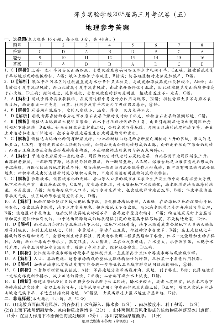 江西省萍乡市萍乡实验学校2025届高三月考试卷(五)地理答案