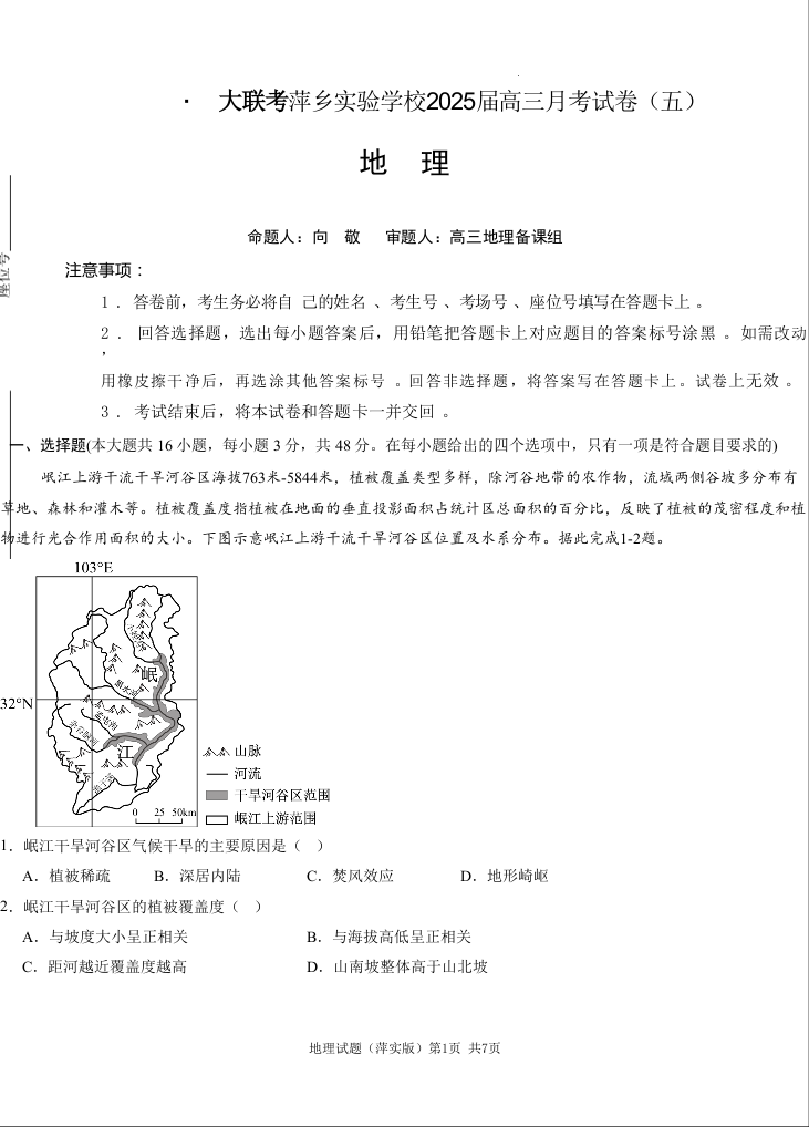 江西省萍乡市萍乡实验学校2025届高三月考试卷(五)地理