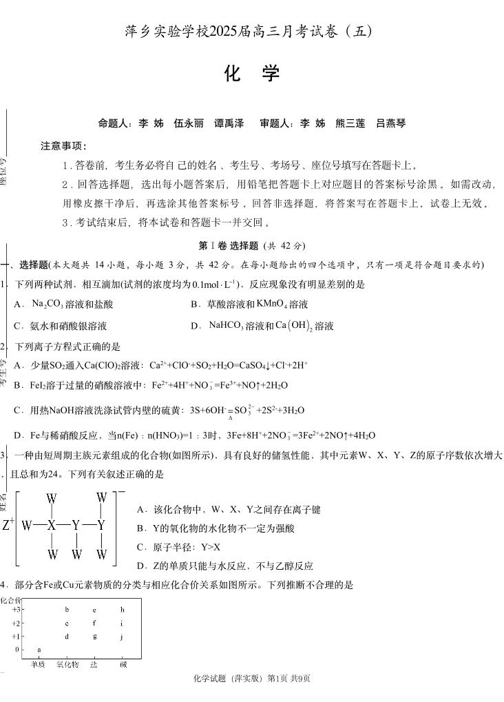 江西省萍乡市萍乡实验学校2025届高三月考试卷(五)化学
