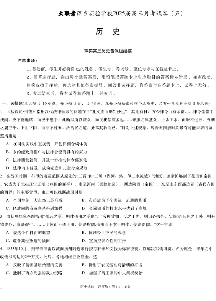 江西省萍乡市萍乡实验学校2025届高三月考试卷(五)历史