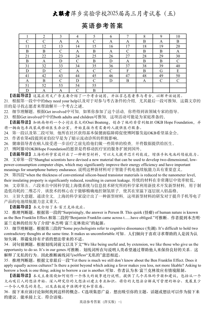 江西省萍乡市萍乡实验学校2025届高三月考试卷(五)英语答案
