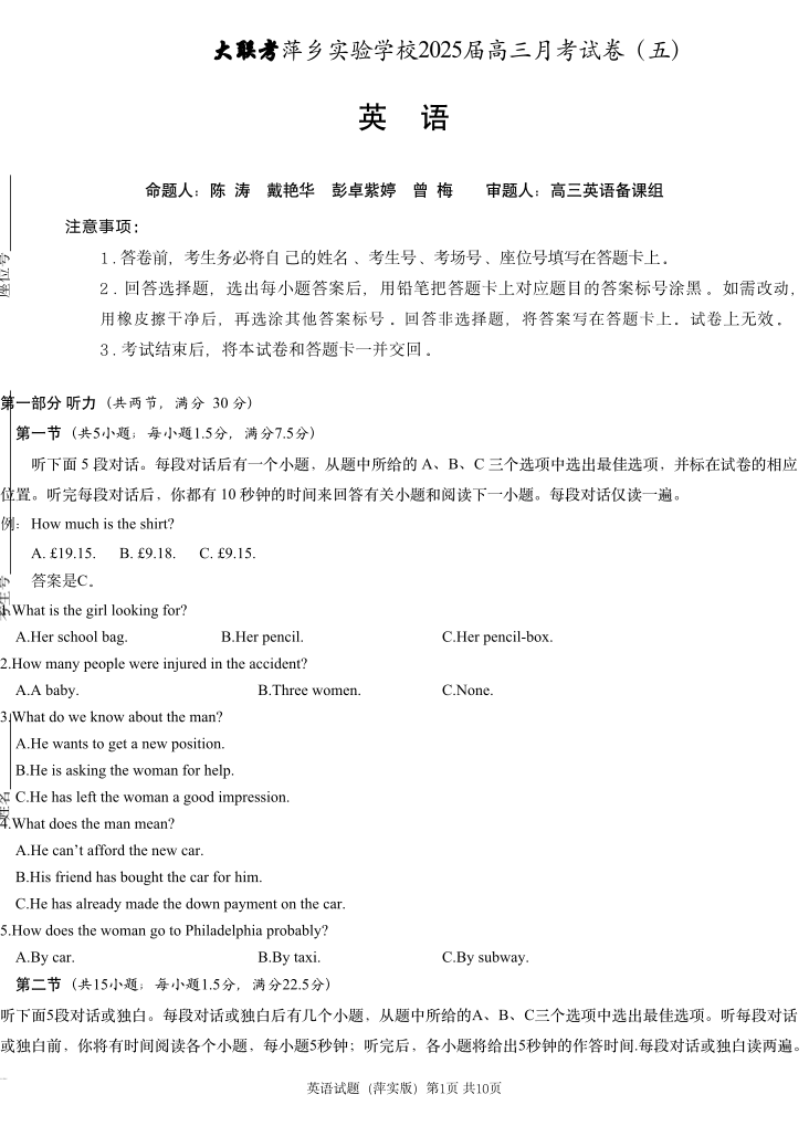 江西省萍乡市萍乡实验学校2025届高三月考试卷(五)英语