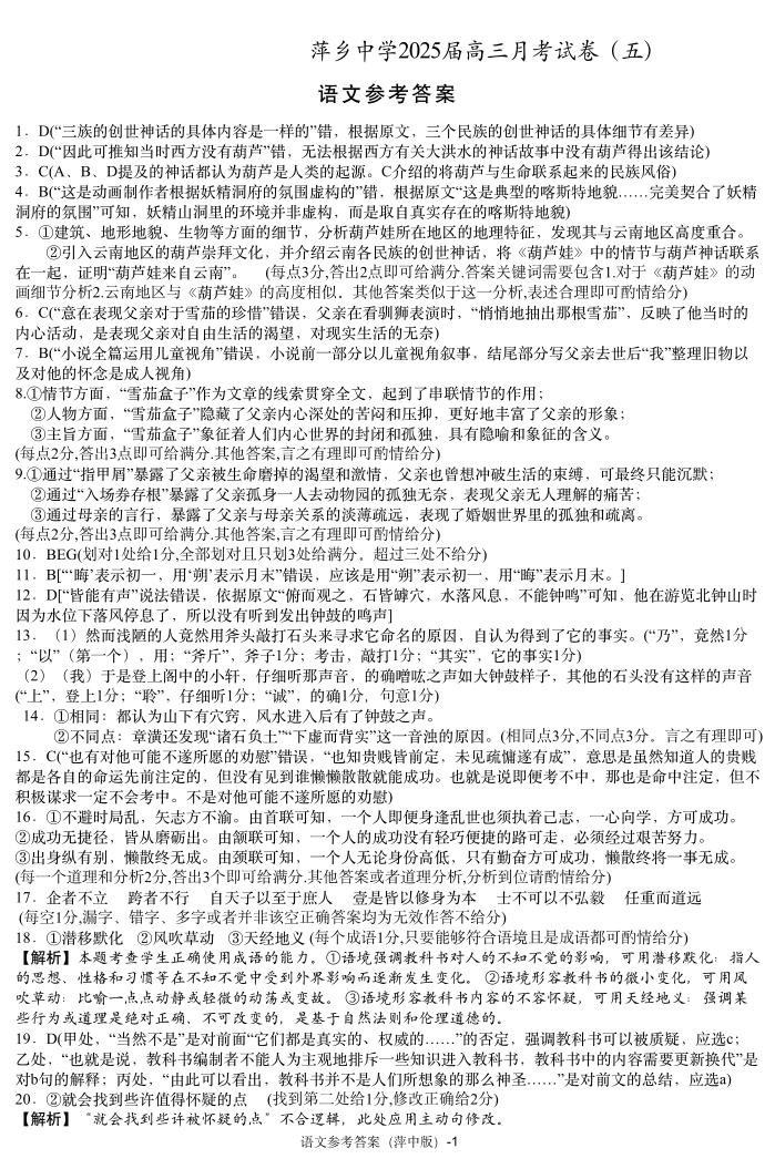 江西省萍乡市萍乡实验学校2025届高三月考试卷(五)语文答案