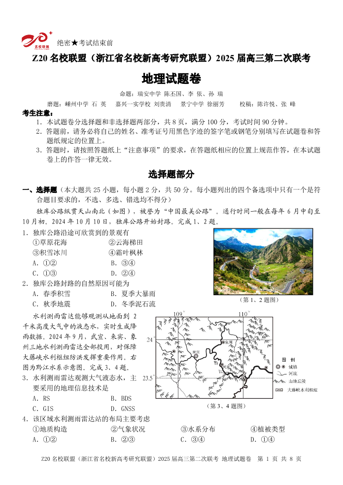 Z20名校联盟(浙江省名校新高考研究联盟)2025届高三第二次联考 地理