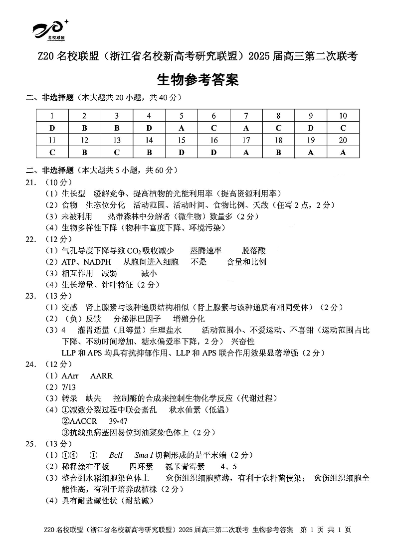 Z20名校联盟(浙江省名校新高考研究联盟)2025届高三第二次联考 生物答案