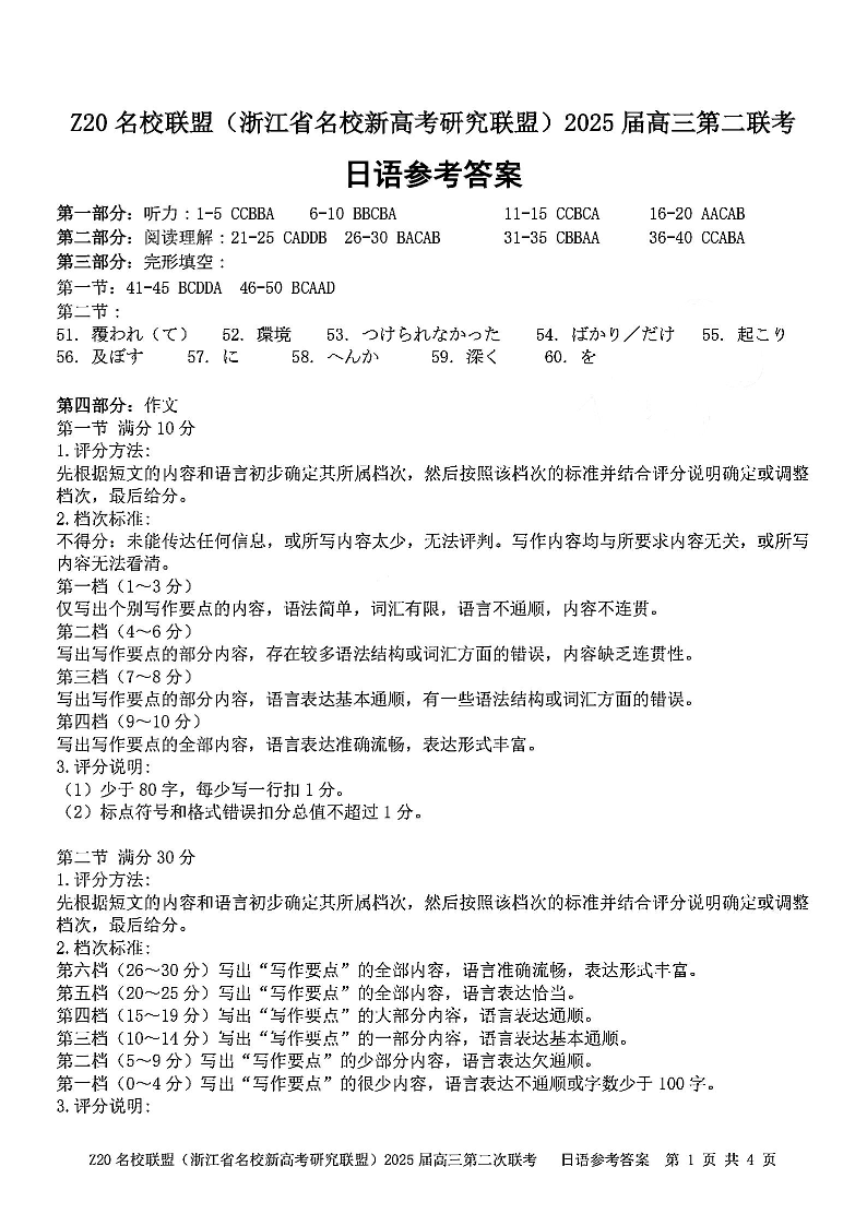 Z20名校联盟(浙江省名校新高考研究联盟)2025届高三第二次联考 日语答案