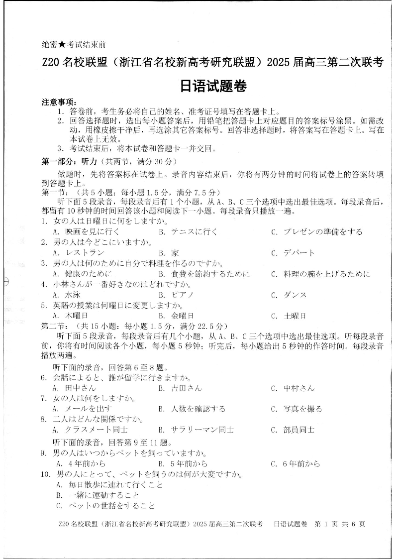 Z20名校联盟(浙江省名校新高考研究联盟)2025届高三第二次联考 日语