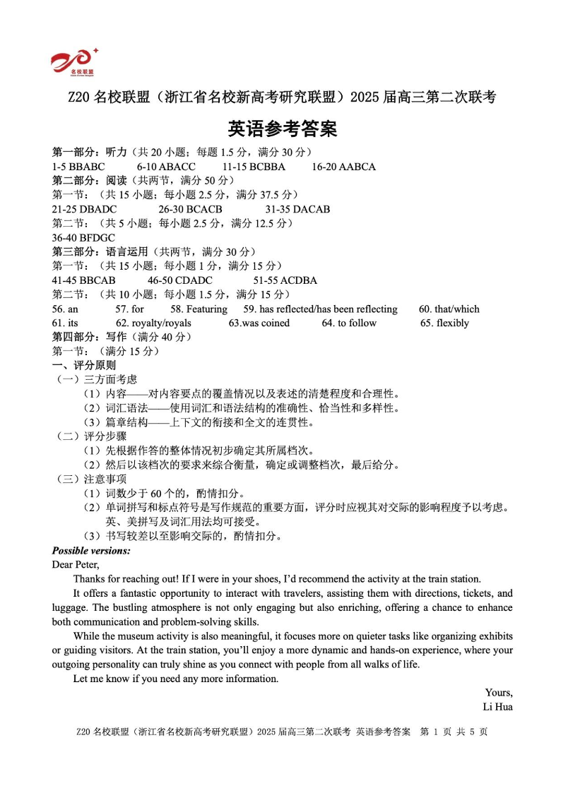 Z20名校联盟(浙江省名校新高考研究联盟)2025届高三第二次联考 英语答案