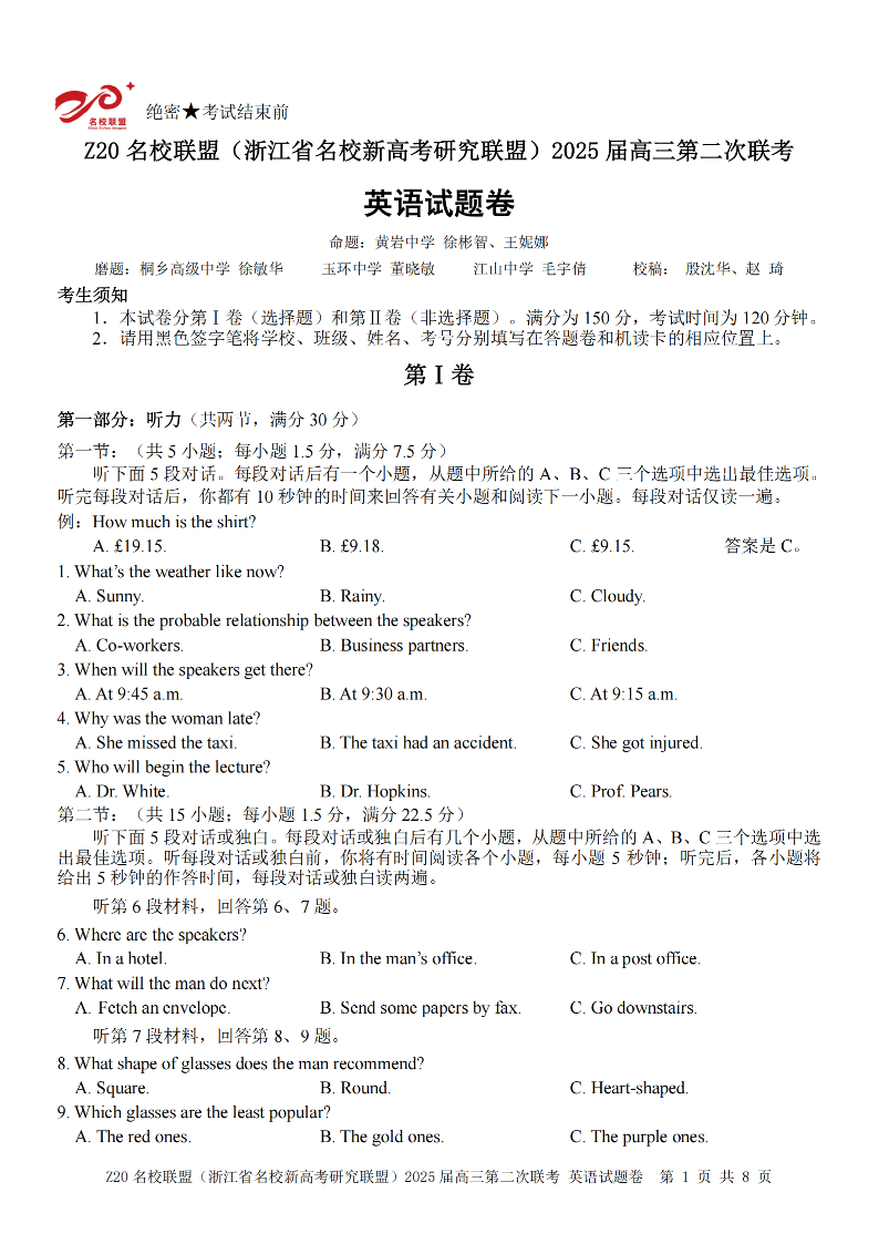 Z20名校联盟(浙江省名校新高考研究联盟)2025届高三第二次联考 英语