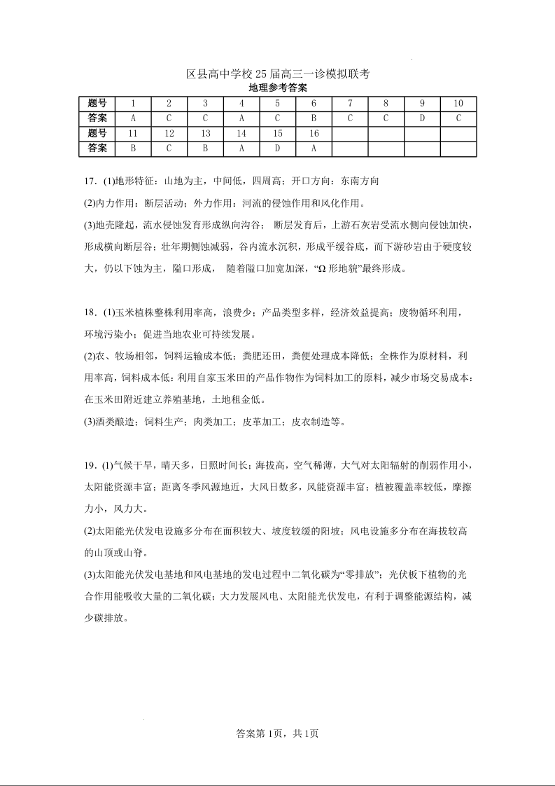 眉山市区县高中学校25届高三一诊模拟联考 地理答案