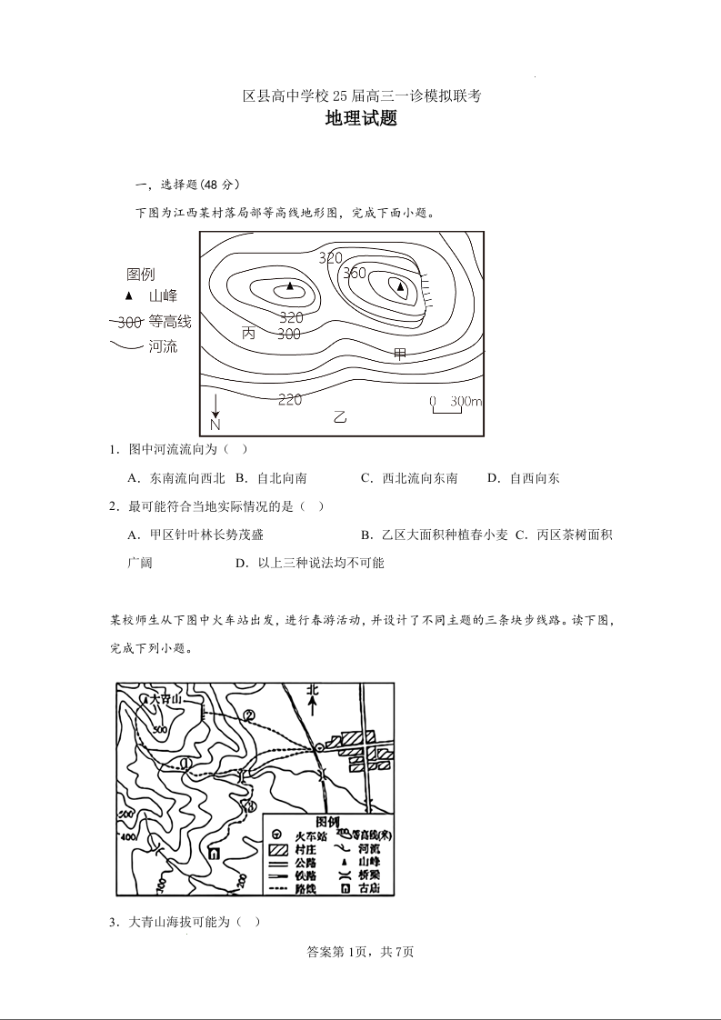 眉山市区县高中学校25届高三一诊模拟联考 地理