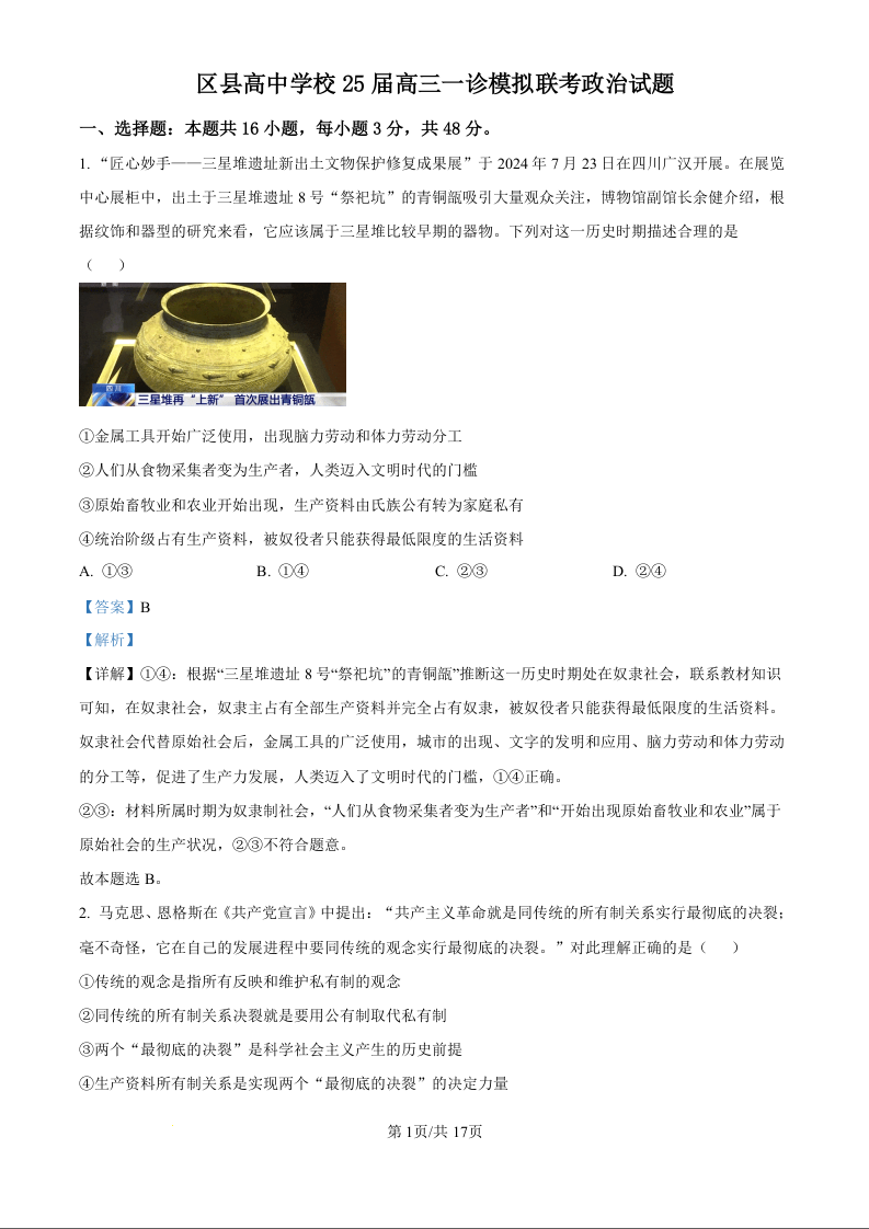 眉山市区县高中学校25届高三一诊模拟联考 政治答案