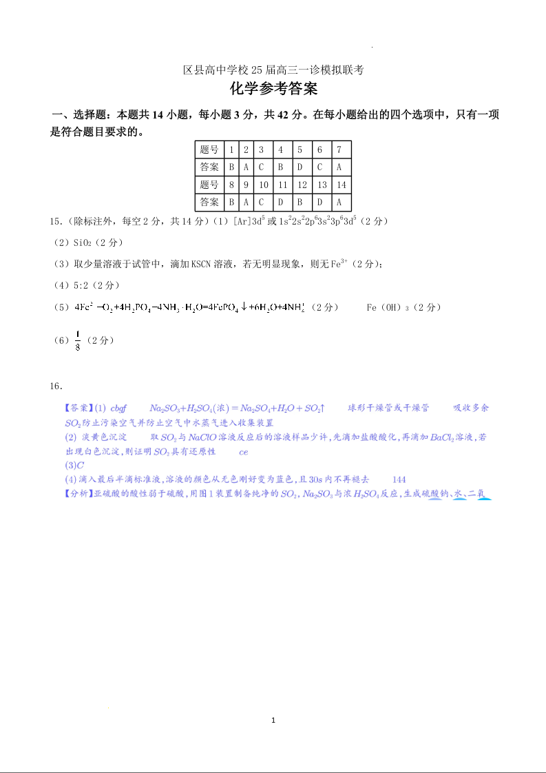 眉山市区县高中学校25届高三一诊模拟联考 化学答案