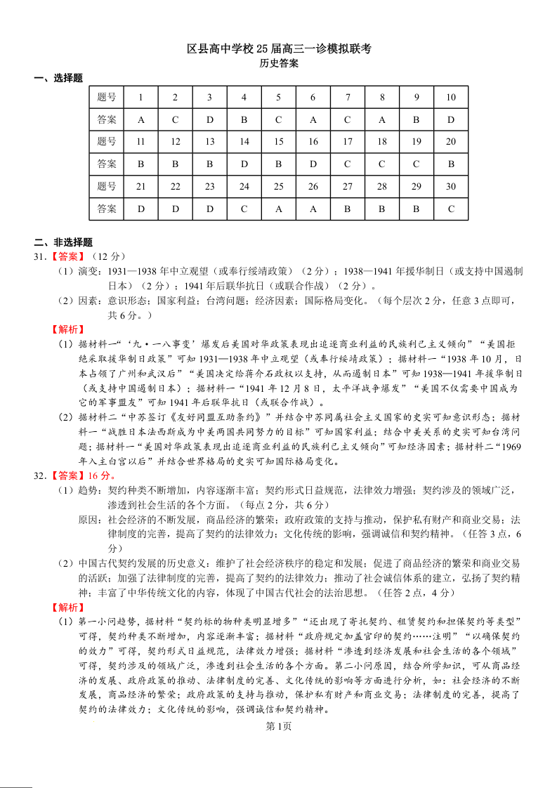 眉山市区县高中学校25届高三一诊模拟联考 历史答案