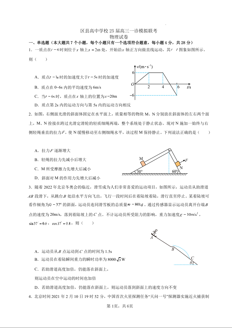 眉山市区县高中学校25届高三一诊模拟联考 物理