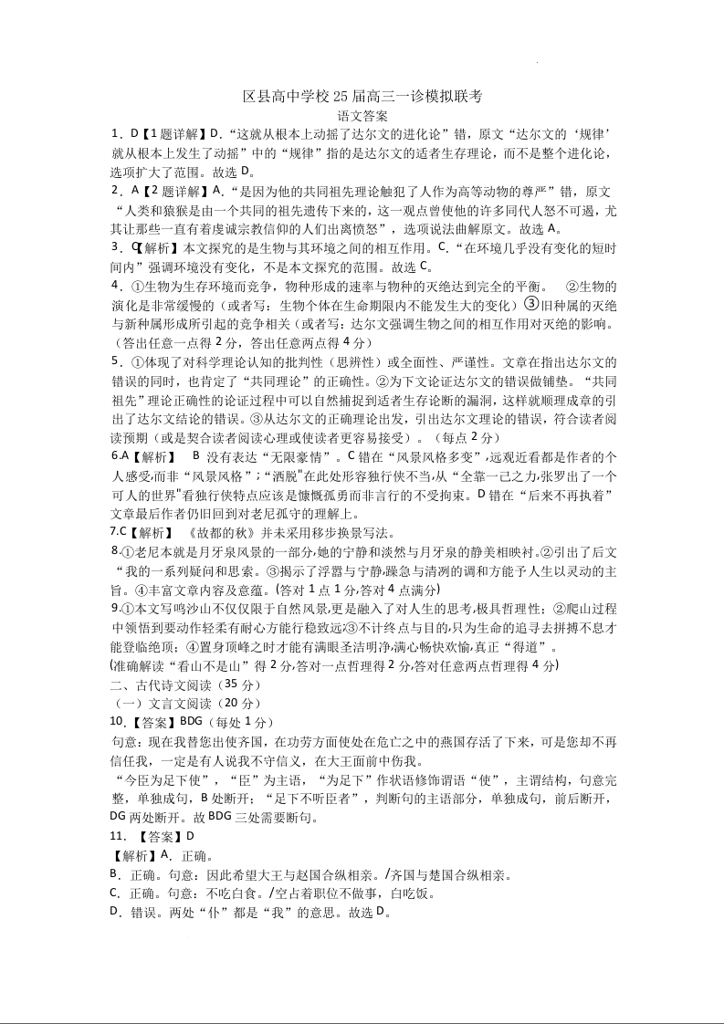 眉山市区县高中学校25届高三一诊模拟联考 语文答案