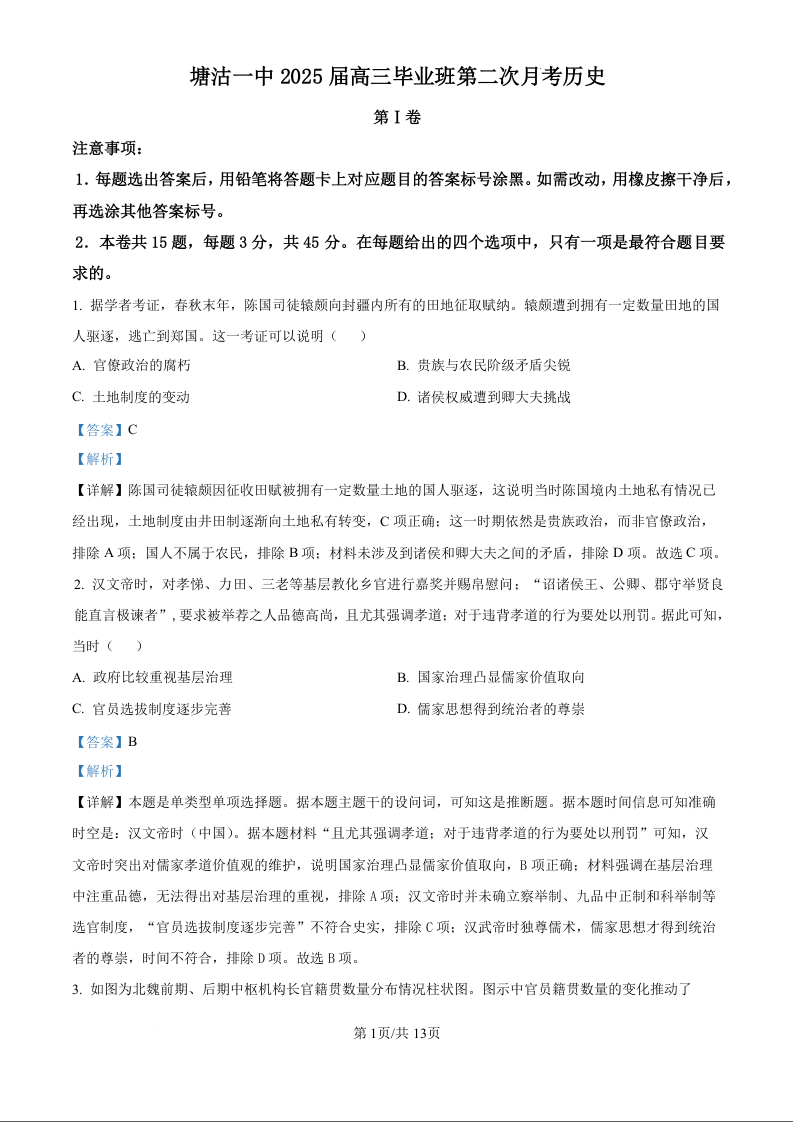天津市滨海新区塘沽第一中学2024-2025学年高三上学期第二次月考 历史答案