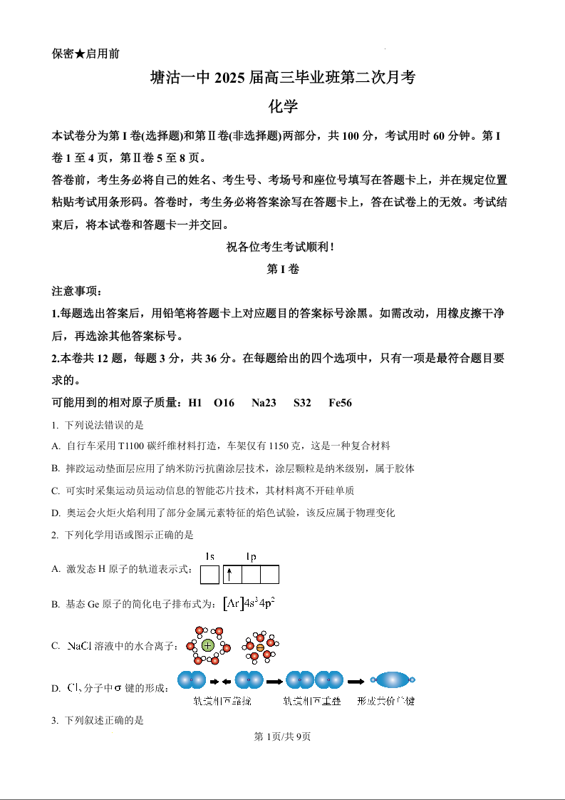 天津市滨海新区塘沽第一中学2024-2025学年高三上学期第二次月考 化学