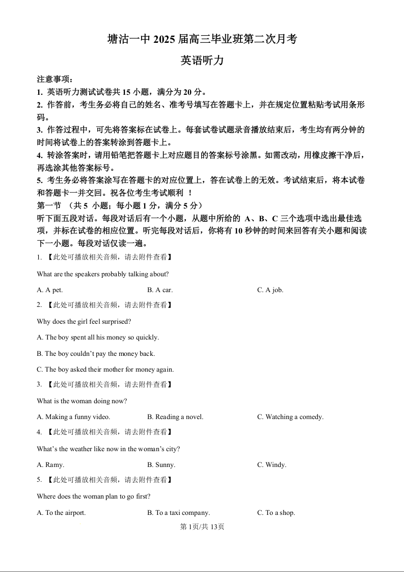 天津市滨海新区塘沽第一中学2024-2025学年高三上学期第二次月考 英语
