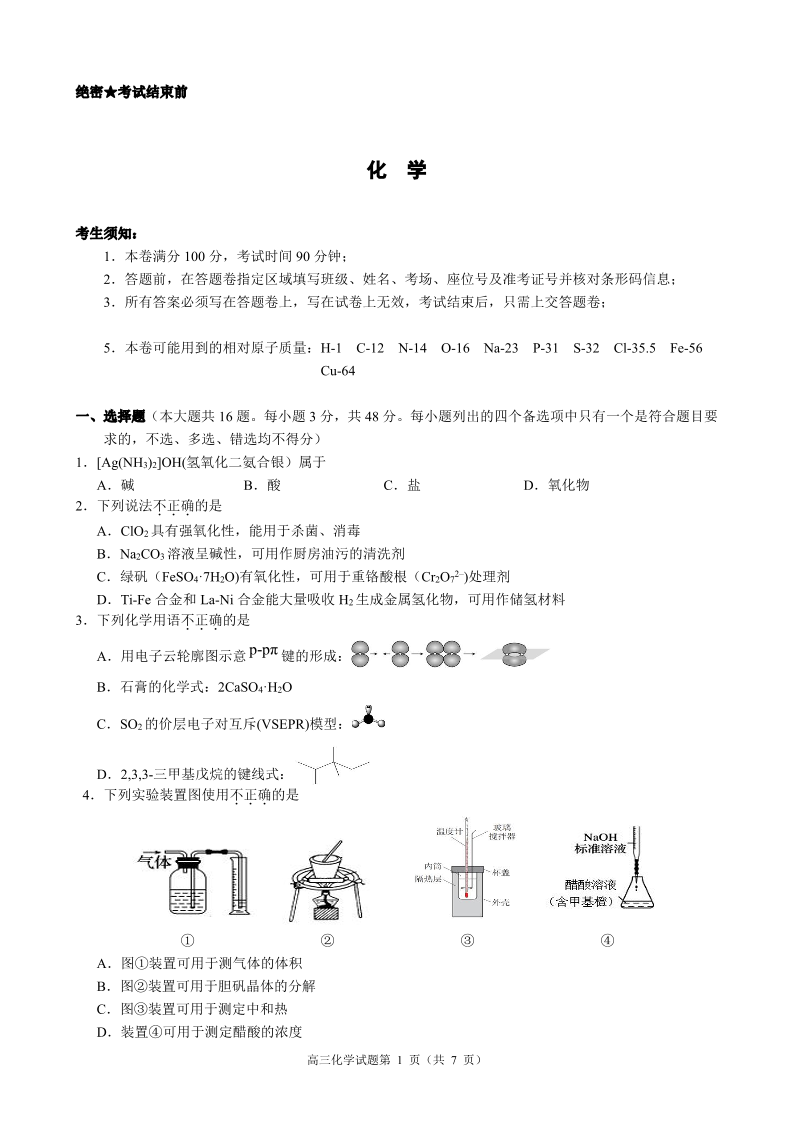 浙江省慈溪中学、舟山中学等多校2025届高三上学期期中考试 化学