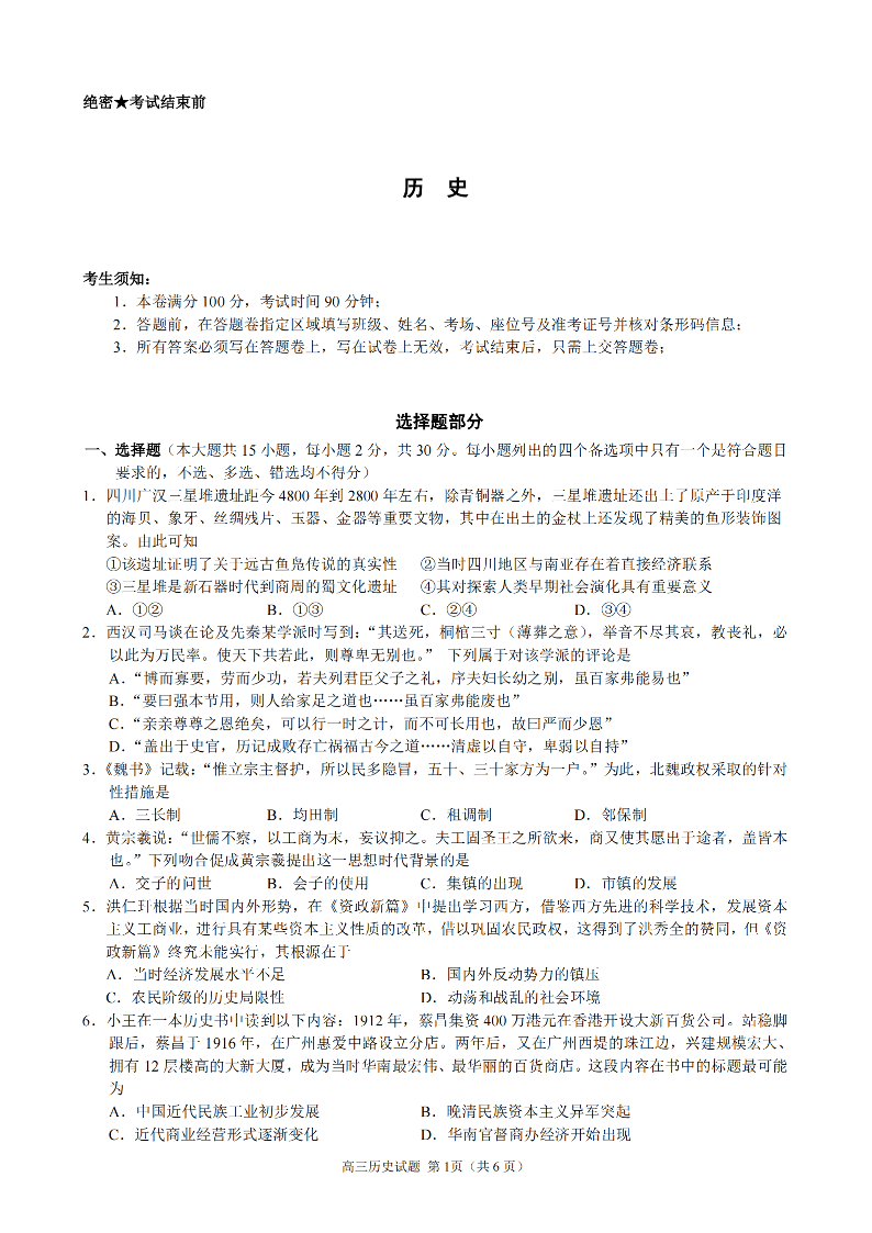 浙江省慈溪中学、舟山中学等多校2025届高三上学期期中考试 历史