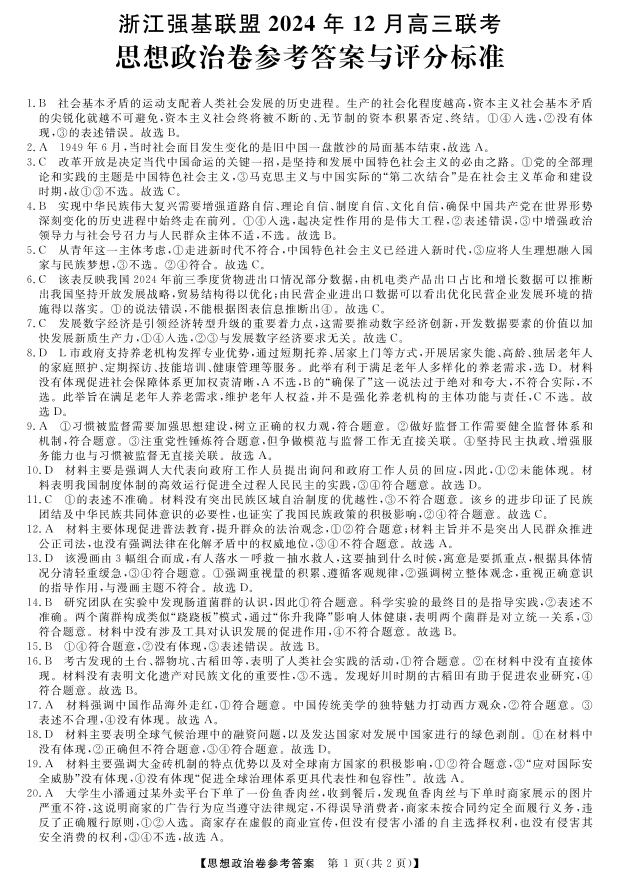 浙江省强基联盟2024年12月高三联考 政治答案