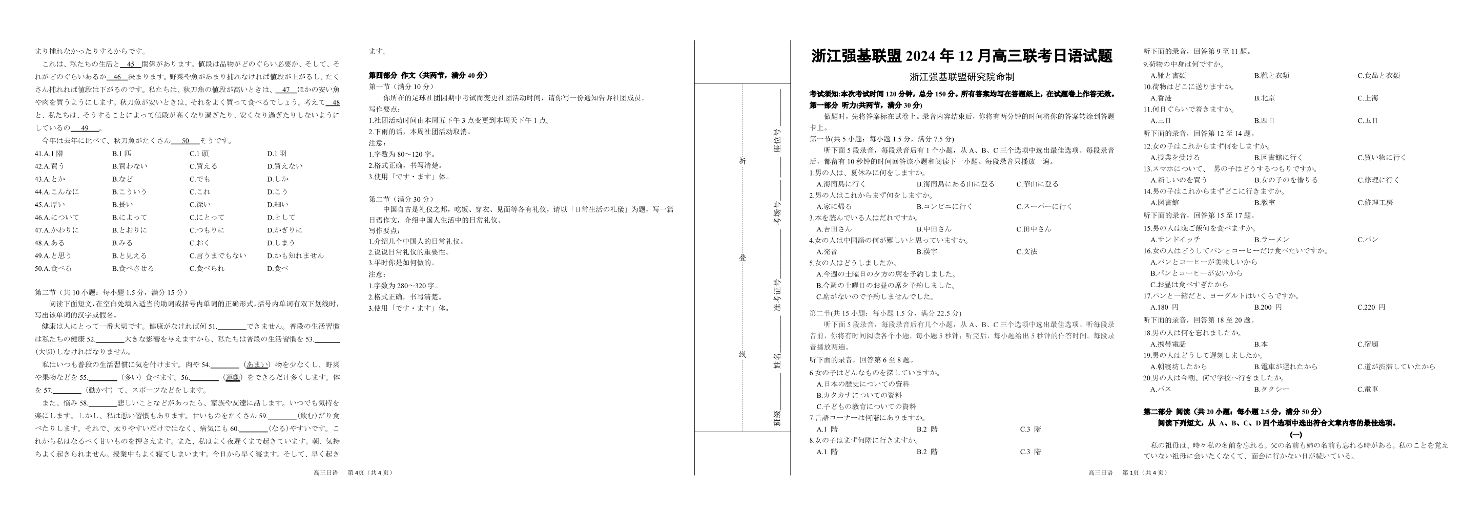 浙江省强基联盟2024年12月高三联考 日语