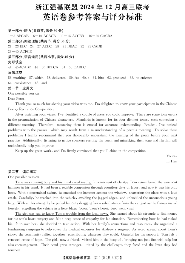浙江省强基联盟2024年12月高三联考 英语答案