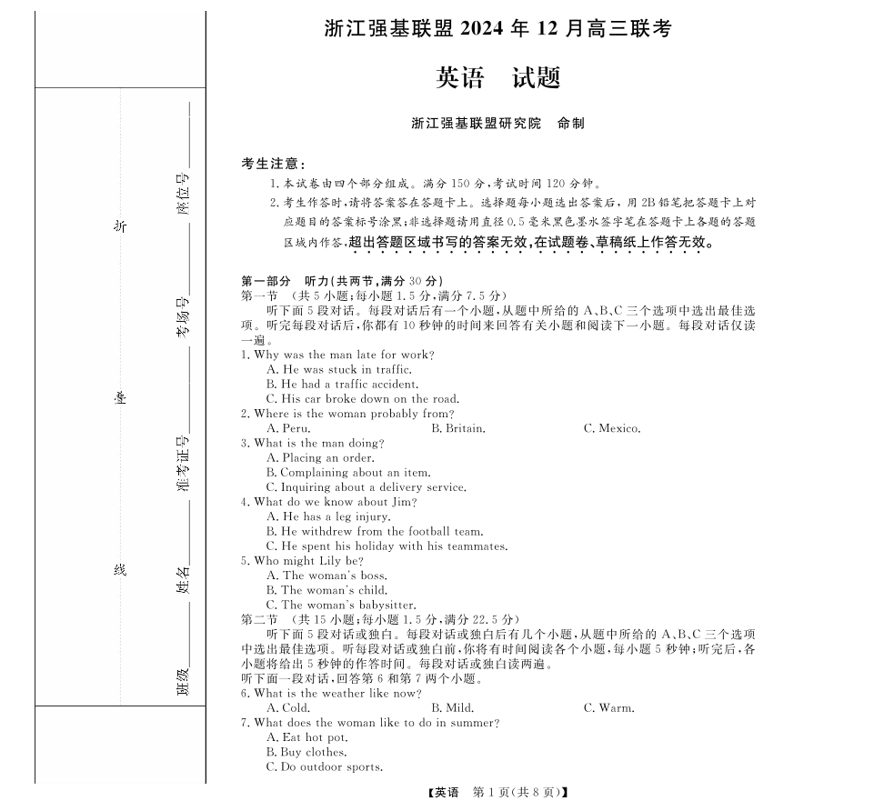 浙江省强基联盟2024年12月高三联考 英语