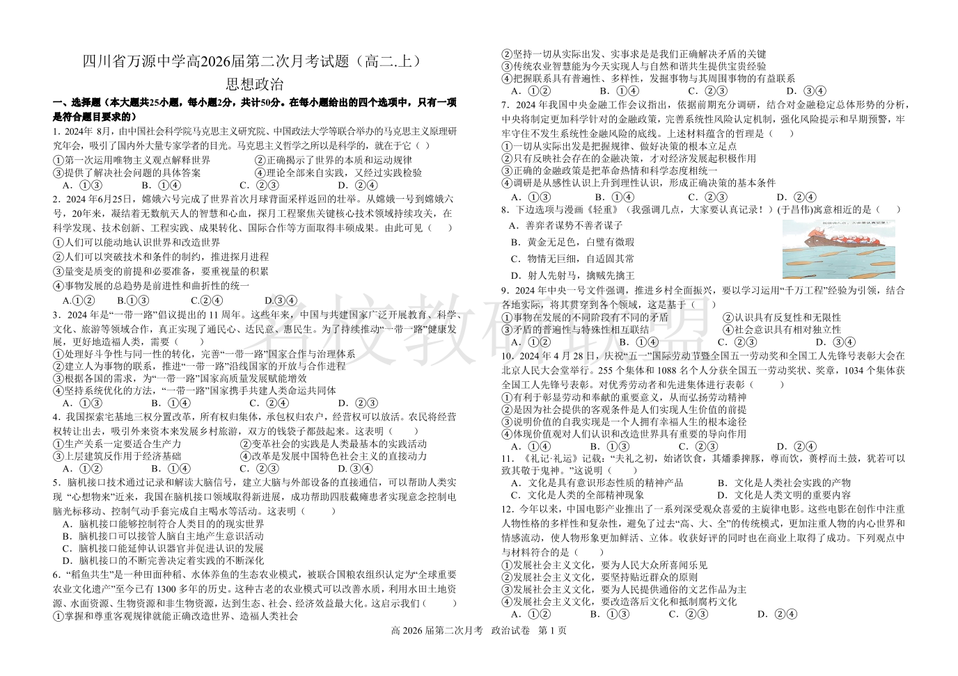 四川省达州市万源中学2024-2025学年高二上学期第二次月考 政治.pdf