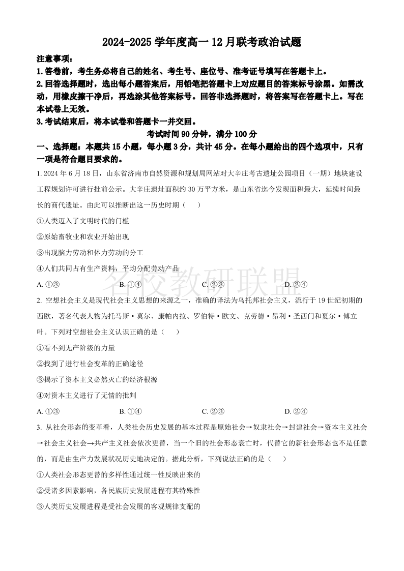 山东省百师联考2024-2025学年高一上学期12月月考 政治.pdf