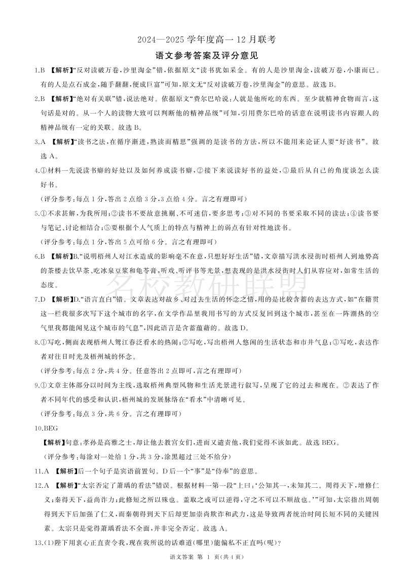 山东省百师联考2024-2025学年高一上学期12月月考 语文答案.pdf