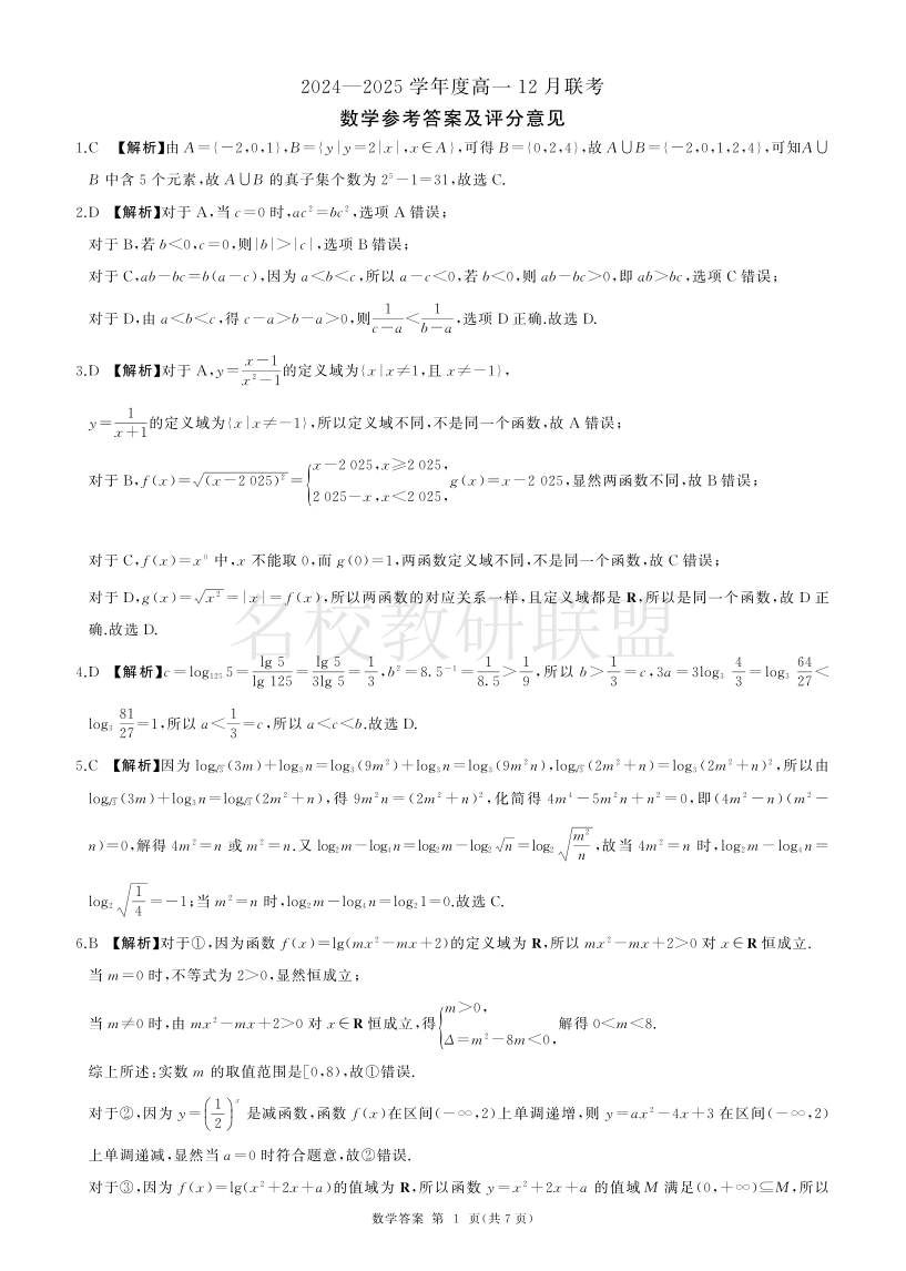山东省百师联考2024-2025学年高一上学期12月月考 数学答案.pdf