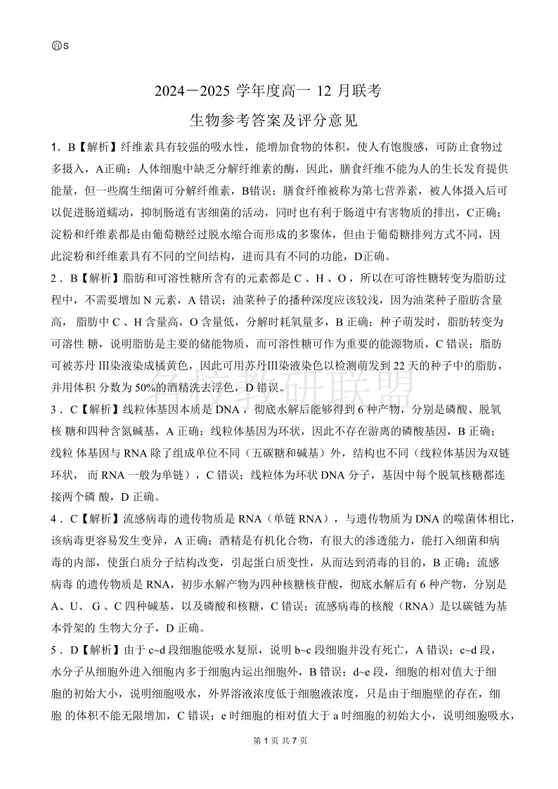 山东省百师联考2024-2025学年高一上学期12月月考 生物答案.pdf