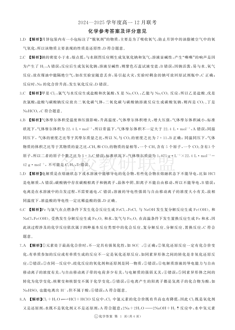 山东省百师联考2024-2025学年高一上学期12月月考 化学答案.pdf
