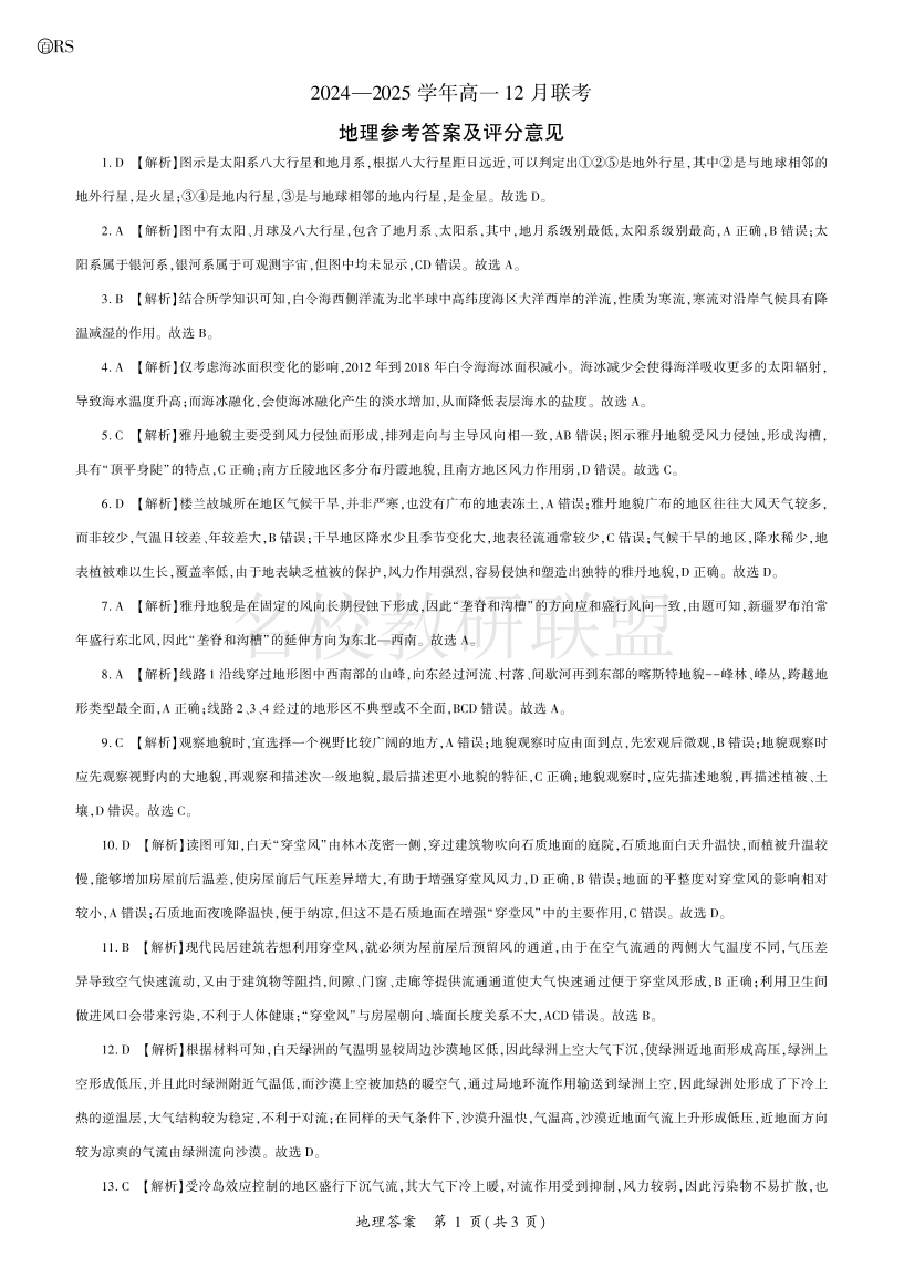 山东省百师联考2024-2025学年高一上学期12月月考 地理答案.pdf