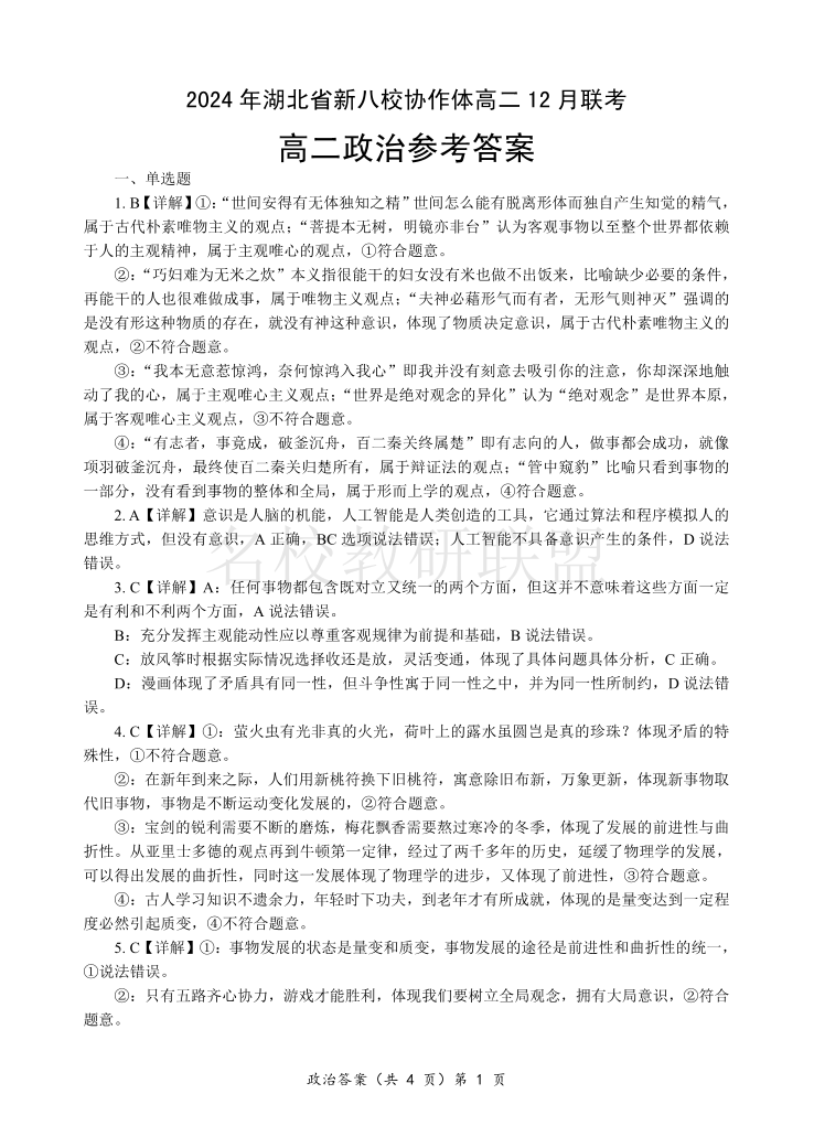 2024年湖北省新八校协作体高二12月联考 政治答案.pdf