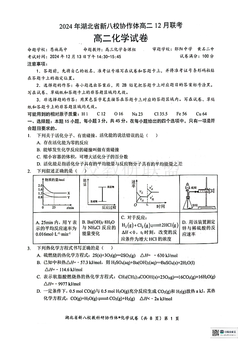 2024年湖北省新八校协作体高二12月联考 化学.pdf