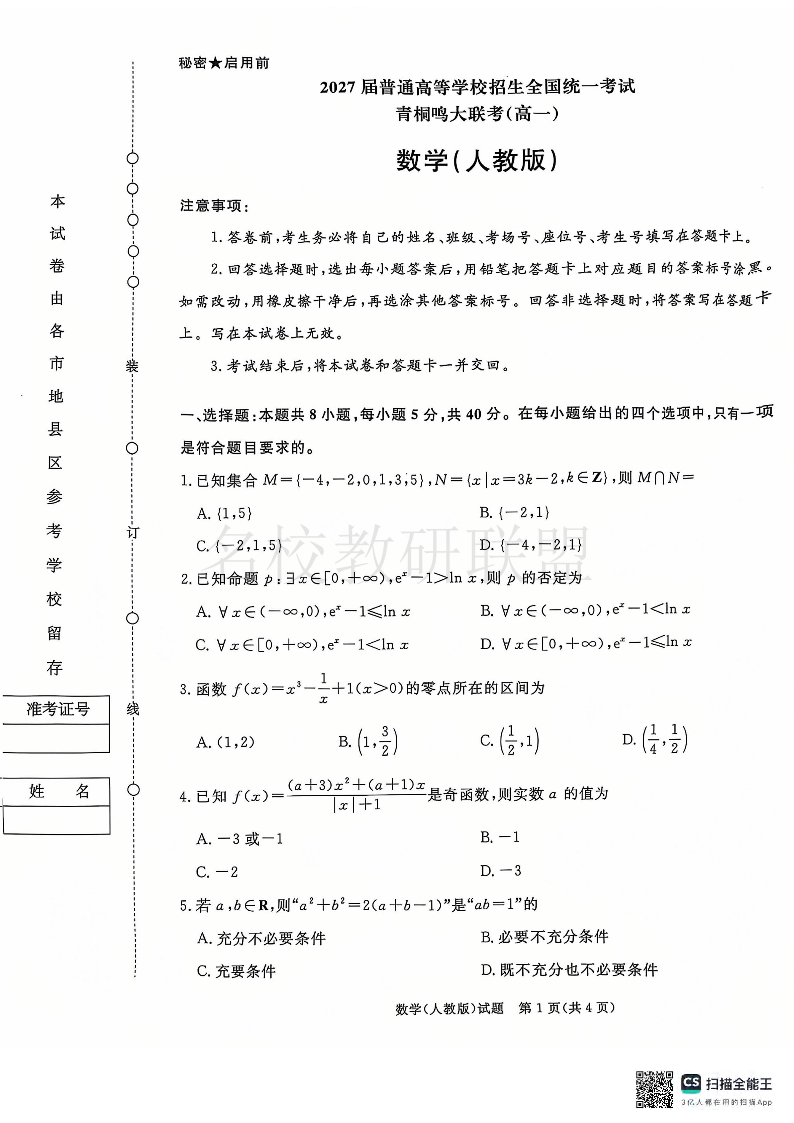 青桐鸣2024-2025学年高一上学期12月大联考 数学.pdf