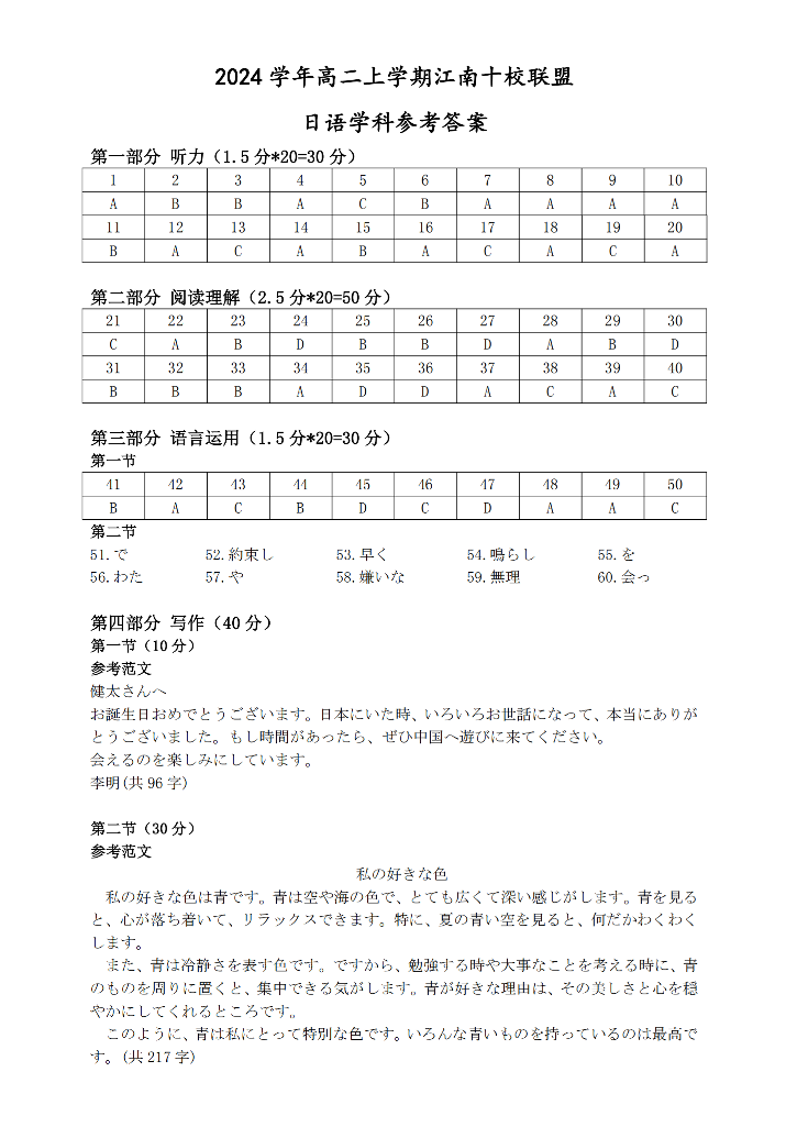 安徽省2024年”江南十校“高二年级12月阶段联考 日语答案.pdf