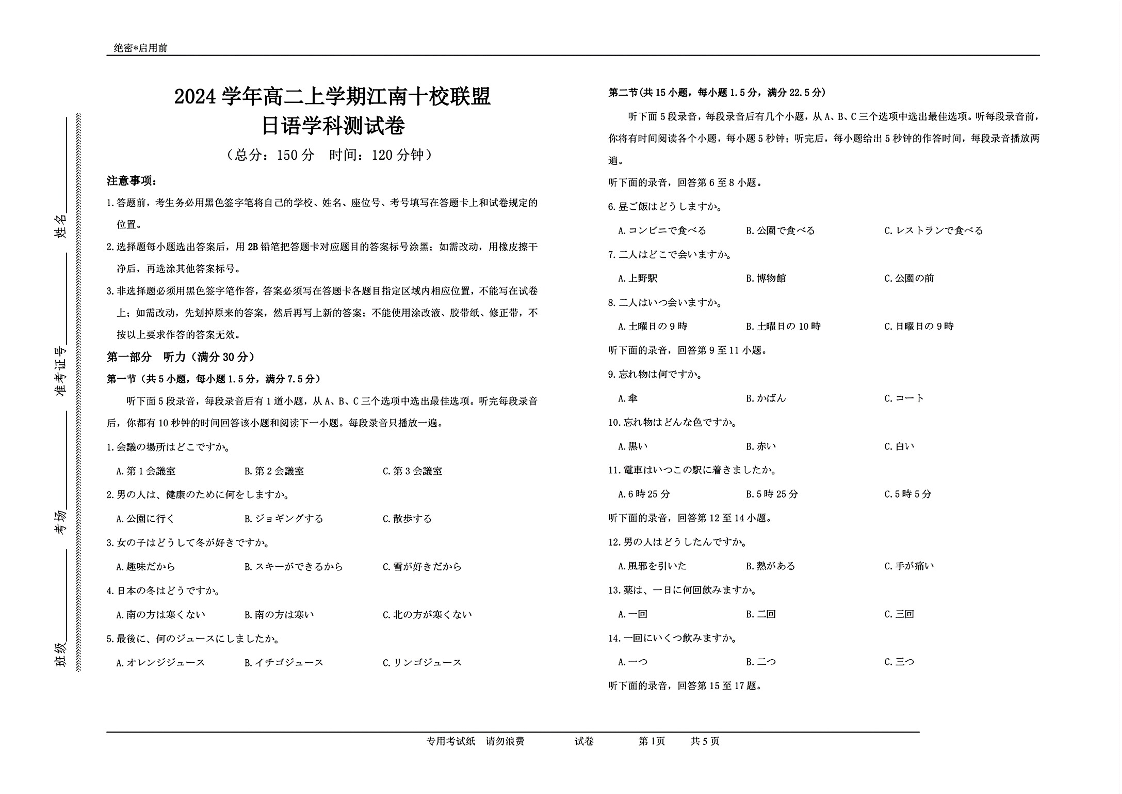 安徽省2024年”江南十校“高二年级12月阶段联考 日语.pdf