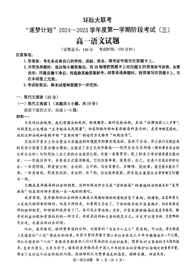 2024-2025学年度第一学期阶段性考试高一语文试题.pdf