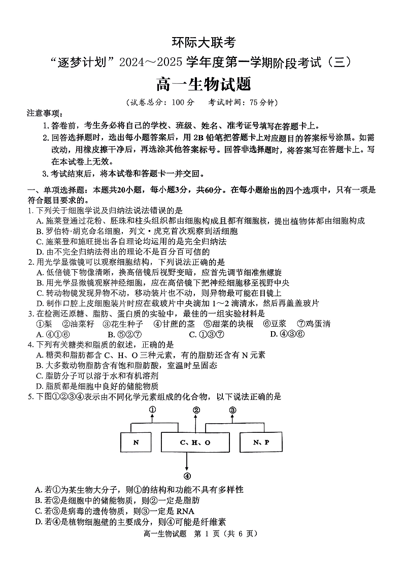 2024-2025学年度第一学期阶段性考试高一生物试题.pdf