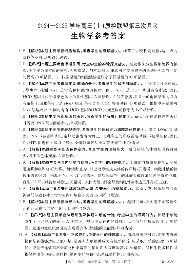 河北省2024-2025学年高三(上)质检联盟第三次月考 生物答案.pdf