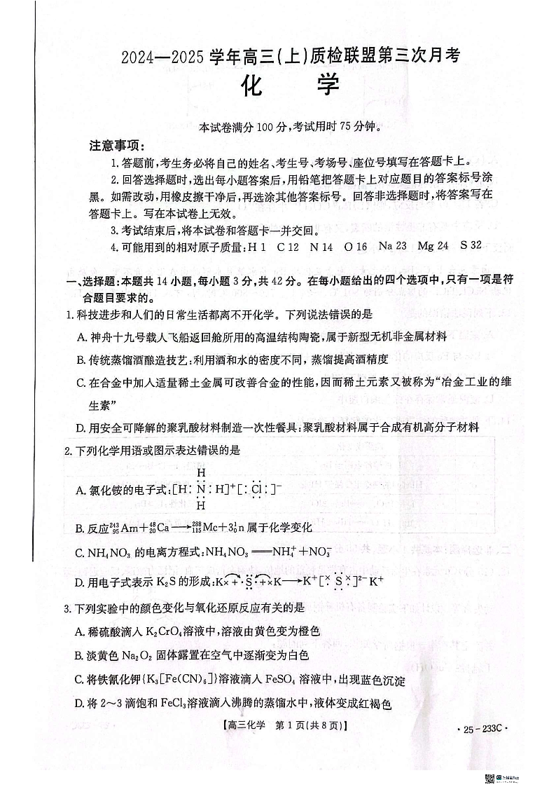 河北省2024-2025学年高三(上)质检联盟第三次月考 化学.pdf