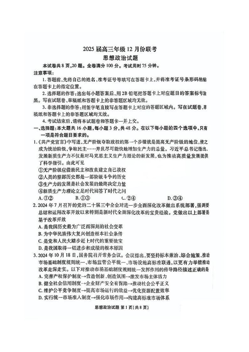 广东省衡水金卷2025届高三上学期12月联考 政治.pdf