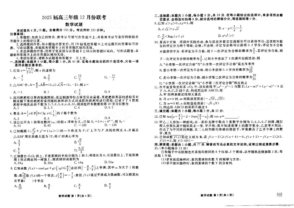 广东省衡水金卷2025届高三上学期12月联考 数学.pdf