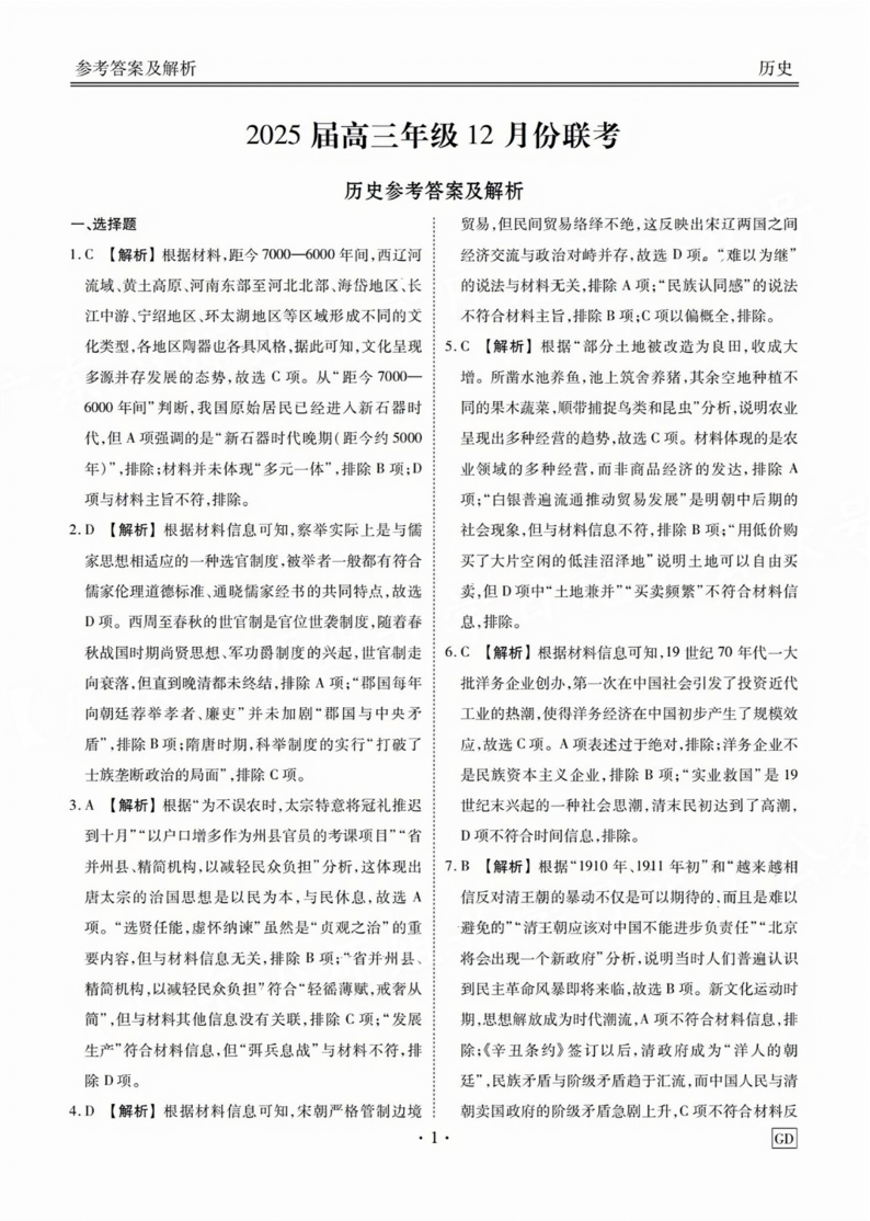 广东省衡水金卷2025届高三上学期12月联考 历史答案.pdf