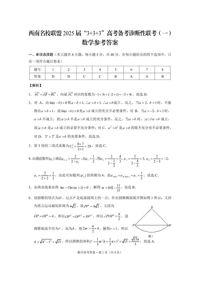 西南名校联盟 2025届 “3+3+3”高考备考诊断性联考(一)数学答案.pdf